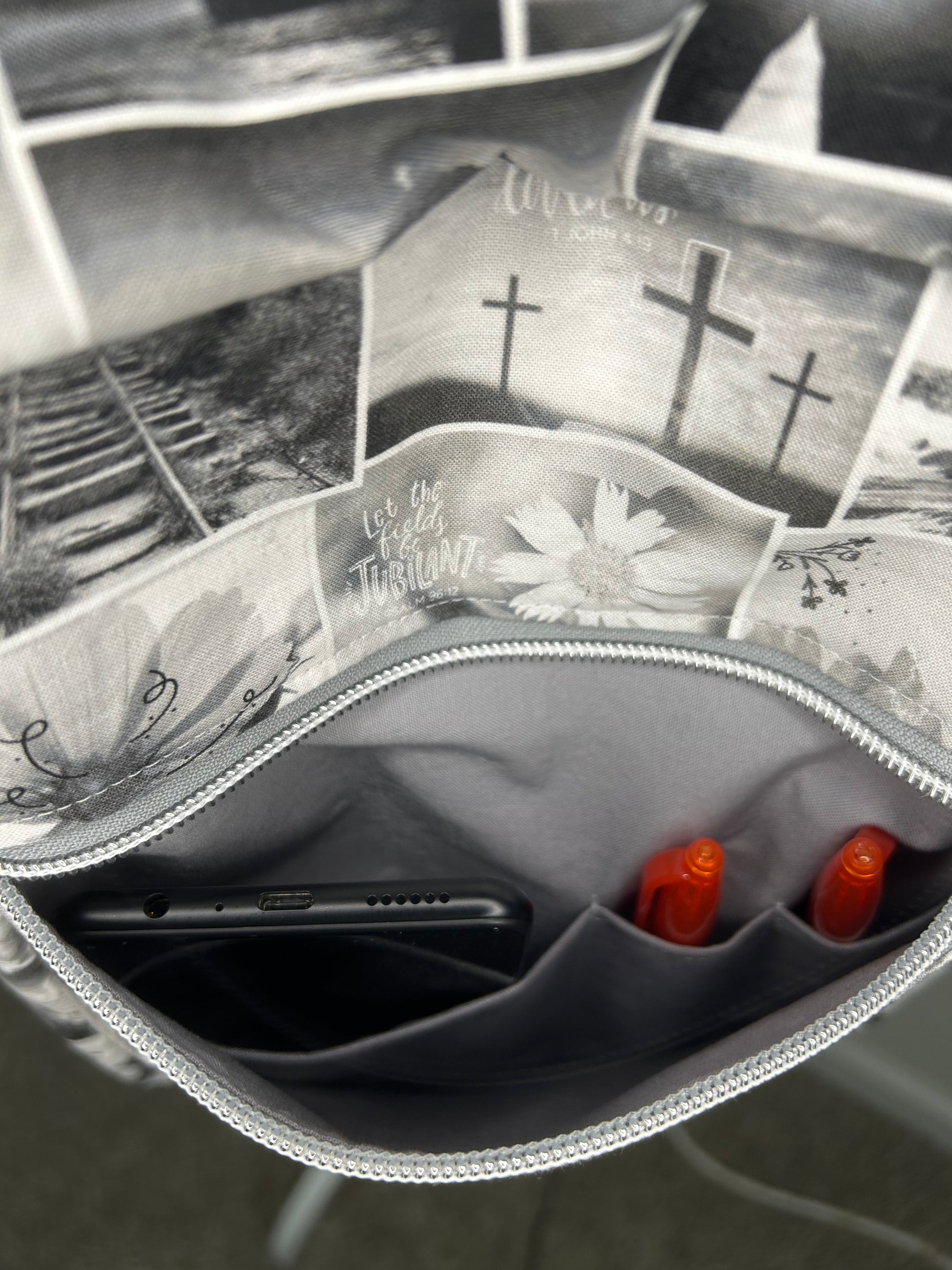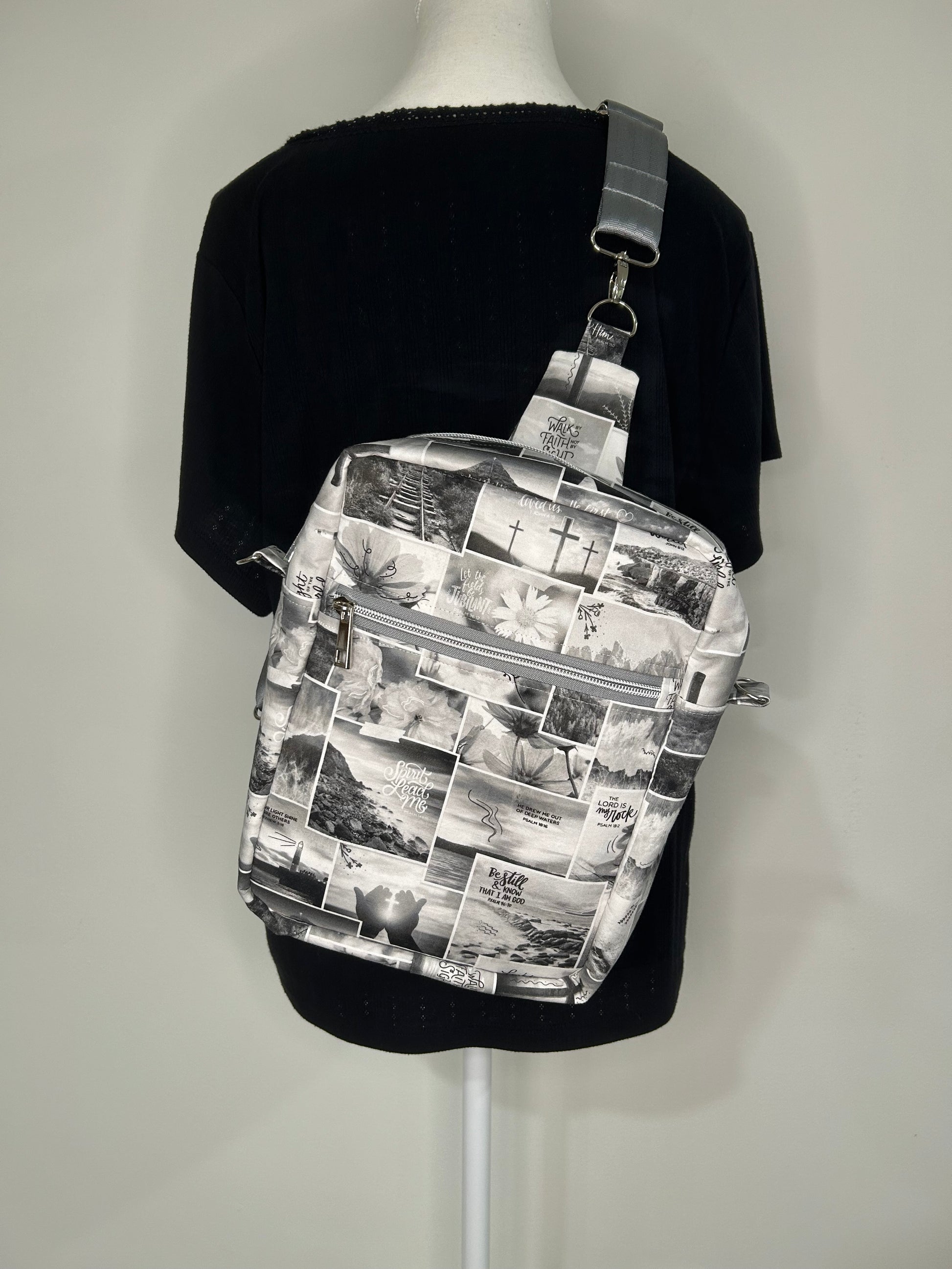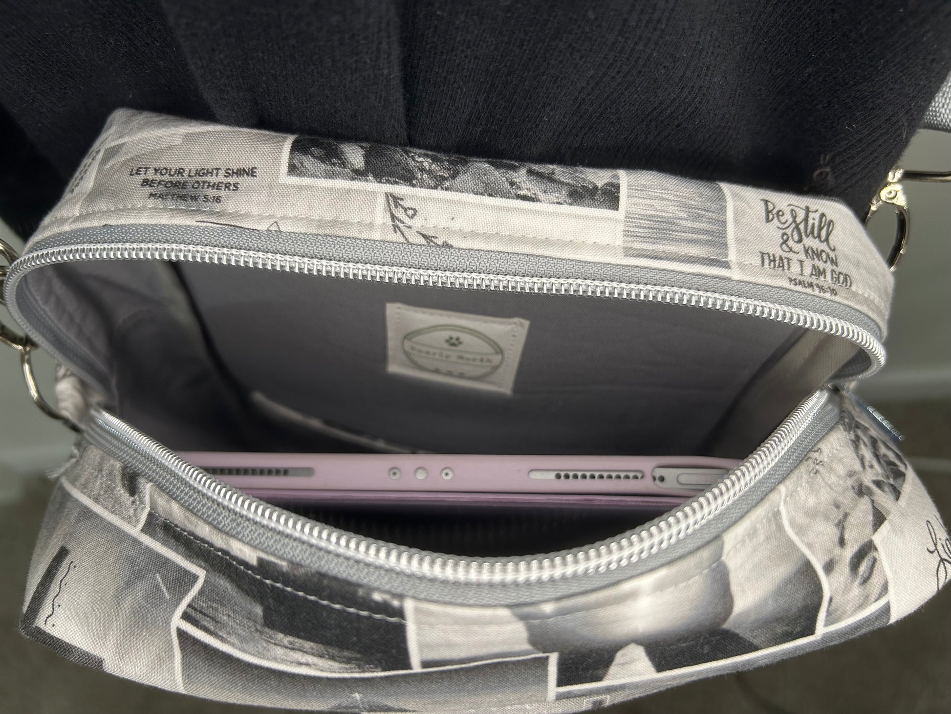 This Handmade Large Deluxe Bible Bag is your perfect playful companion for daily adventures. Made from soft cotton, it measures approximately 7.75”w x 12”h x 3.25”d, roomy enough to safely hold your iPad Pro thanks to foam interfacing. Multiple pockets keep your essentials organized: an exterior zipper pocket with space for pens and phone, a rear slip pocket with a magnetic closure, and an interior slip pocket. Wear it your way—as a crossbody, sling, or shoulder bag—with hidden magnets that tuck the strap neatly when not in use. (iPad, phone, and pens not included!) Adapted from a pattern by Plains and Prairie.
