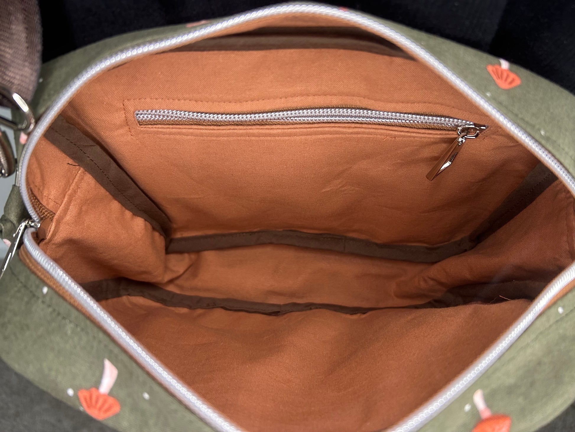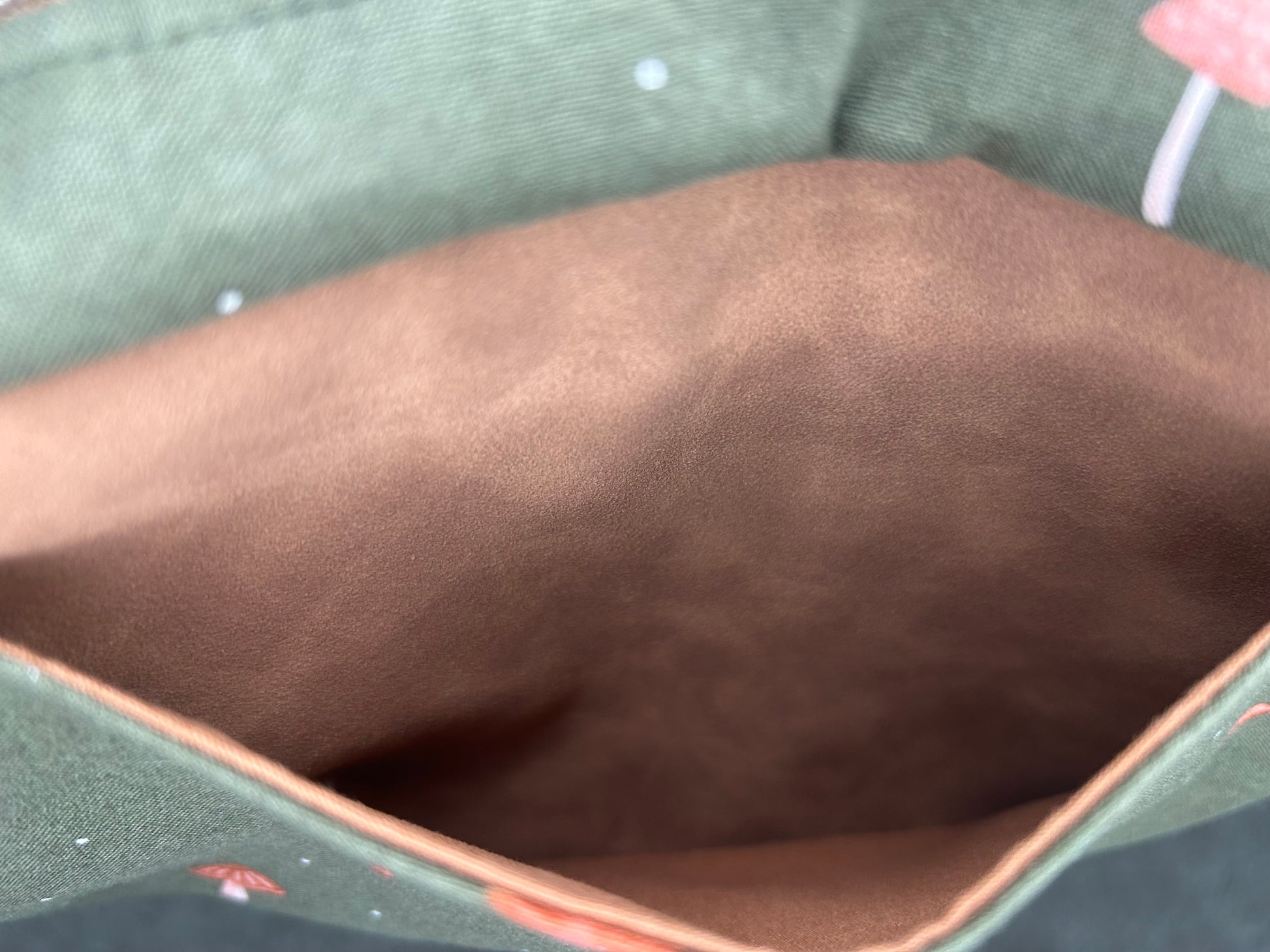 This handmade Mushroom and Vinyl Trio Camera Crossbody Bag blends soft cotton with stylish suede vinyl details for a unique look. Measuring about 9” wide by 6.5” high and 2.25” deep, it’s perfectly sized for your essentials. Keep your gear organized with one exterior zipper pocket, an interior zipper pocket, plus an easy-access exterior slip pocket featuring half suede vinyl. Ready to add a fun and functional touch to your day? This bag is your new go-to companion!
