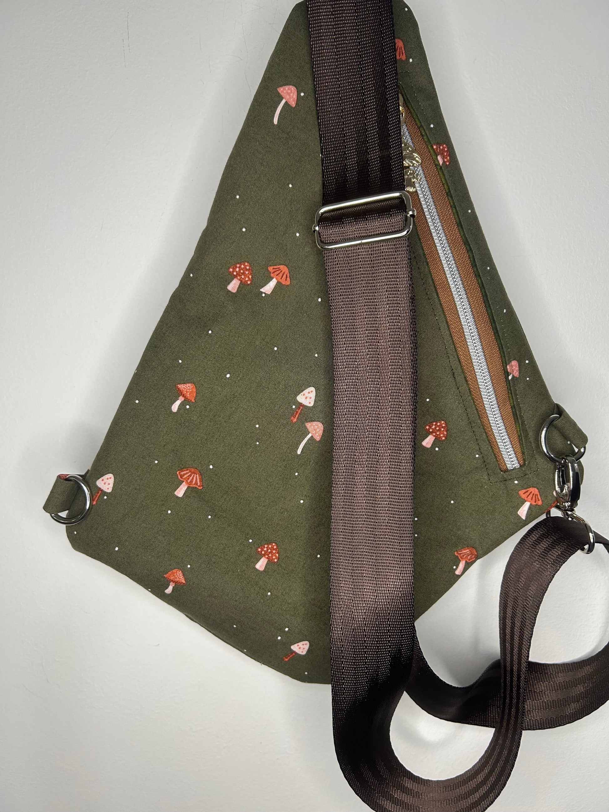 Meet your new favorite adventure buddy—the Handmade Mushroom Traveler Convertible Sling Bag! Crafted from cozy cotton mushroom fabric, it features a front zipper pocket and a hidden rear zipper pocket, each with a charming mushroom zipper pull. Keep your phone handy in the front magnetic pocket, while enjoying the perfect size at about 8” wide by 12.75” high. Designed by Kandou Patterns, this playful bag blends whimsy with functionality for wherever your travels take you!