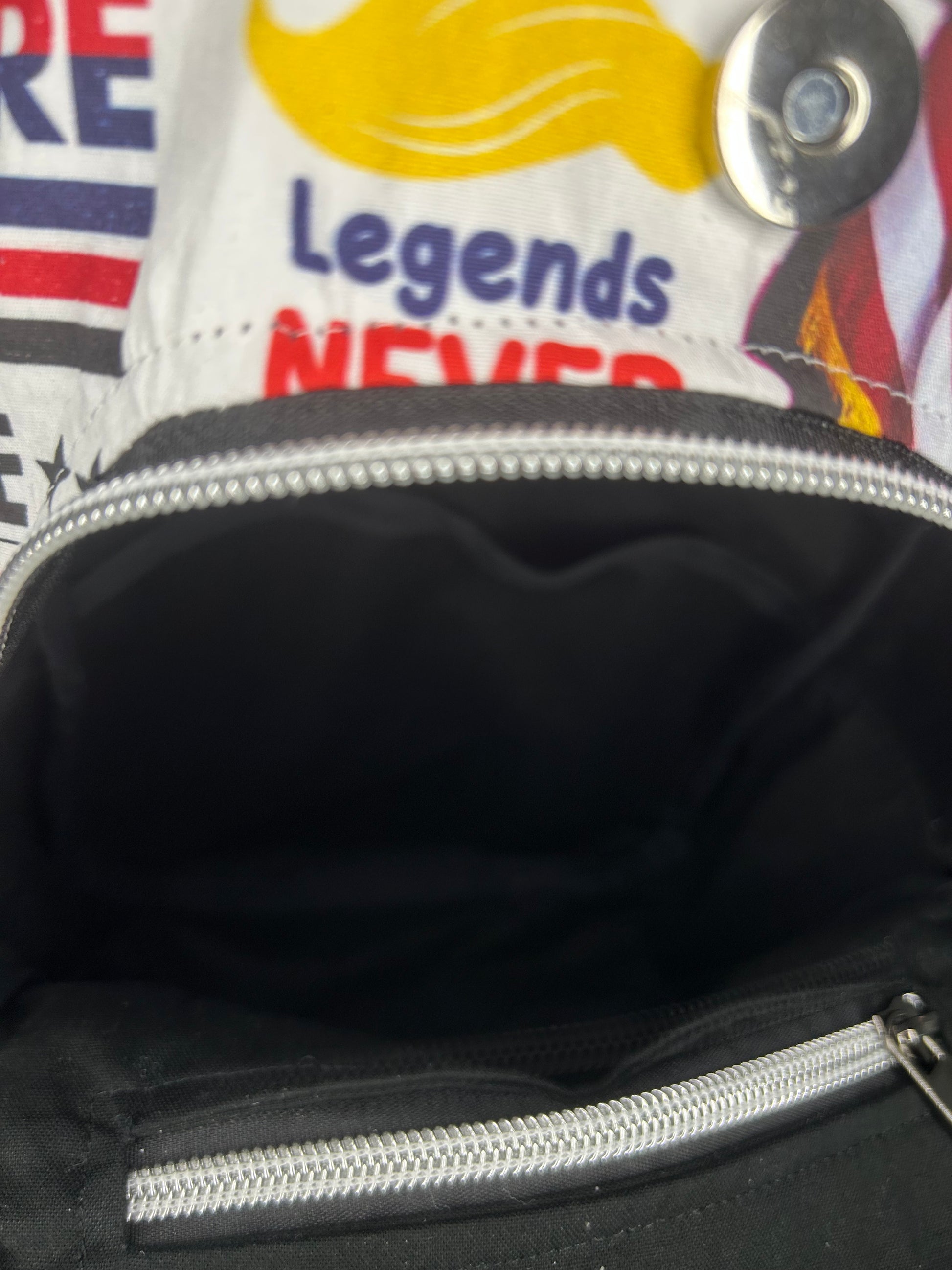 Carry your essentials with a twist using the Trumpland Retro Sling Bag. Made from soft cotton featuring a bold President Trump fabric, this bag stands out in any crowd. Its practical design includes an exterior slip pocket with a magnetic closure, a hidden rear zipper pocket for extra security, and convenient interior slip and zipper pockets to keep things organized. Crafted with a unique pattern by Kandou Patterns, it blends fun and function in one playful package. Perfect for those who like their style with a side of personality!